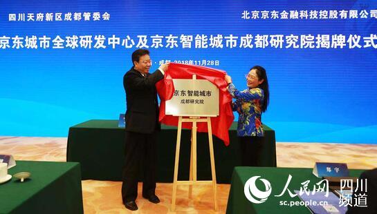 成都信息工程大學黨委書記周激流和西南交通大學副校長朱健梅共同為京東智能城市成都研究院揭牌(圖片由主辦方提供)