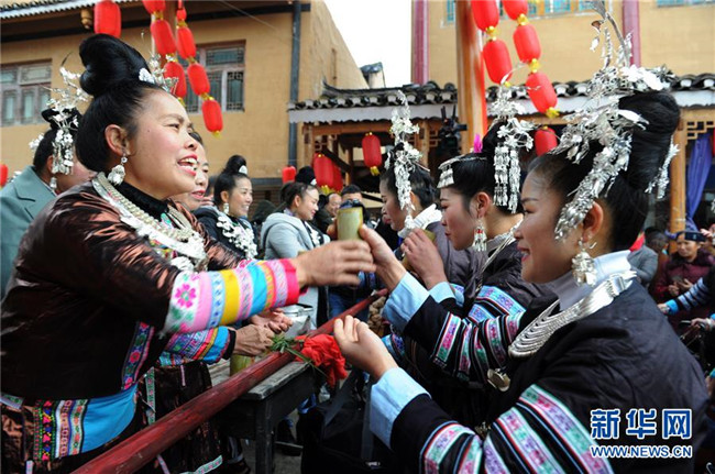 12月9日,貴州省黎平縣中潮鎮(zhèn)佳所侗寨的村民在攔門敬酒?!⌒氯A社發(fā)(楊文斌 攝)