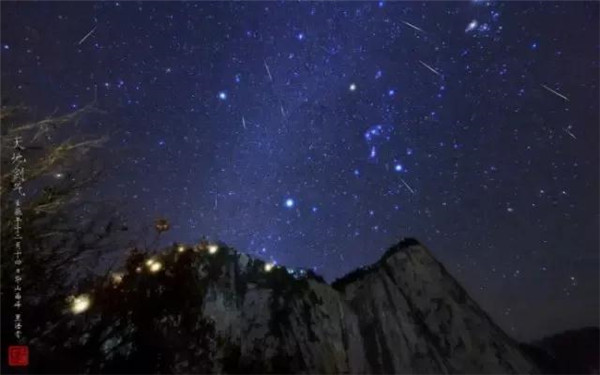 夜晚的華山,斑斕明亮的星星照亮整個夜空,華山構(gòu)成了一幅流光溢彩的奇幻夜色景觀。