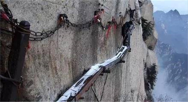 長空棧道,可謂華山險道之首,它猶如一道奇異的仙練鑲嵌在南峰絕壁。明代“后七子”之一的李攀龍《太華山記》載:“出南天門向西就是棧道,棧雖有銅柱鐵索攔護,然闊不盈尺。行二十余丈方至盡頭。下折為井,高約三丈,旁出復為棧……”置身其中,只覺背空腳虛,發(fā)豎氣閉,寒風沖襠,骨松筋緊,膽大者有凌空欲飛之感,膽弱者心生抵近鬼門之憂。多少年來“長空棧道”以它特有的絕險情懷召喚著天下英雄豪杰一試身手,體驗驚心動魄,揮灑豪邁人生。