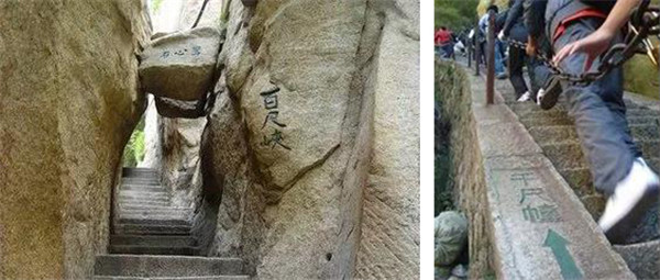 千尺幢,是經(jīng)華山峪登主峰的必經(jīng)之道。這里原為一崖間裂隙,直立70度,后來人們沿隙鑿拓成路,有石階370級,階寬僅容半足,游人登臨時,仰視一線天,俯視若臨深井。百尺峽在“千尺幢上,也是巖隙險道,有石階91級,游人須挽索而上。有詩云:“幢去峽復來,天險不可瞬,雖云百尺峽,一尺一千仞”。