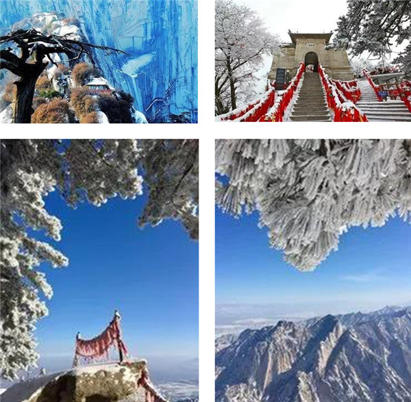 華山在11月進入冬季,12月至次年3月全山飄雪,而2月前為最旺雪期。游客可欣賞到難得一見的華山雪景——美麗的霧凇給樹木、巖石、屋舍都披上一層晶瑩的薄衣,尤其在大雪覆蓋后,山景變成一幅曼妙的白色圖畫,峰上的樹木和古藤被透明的冰層包裹,極富魅力。