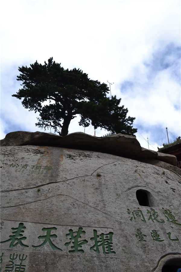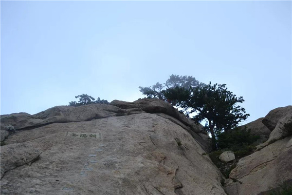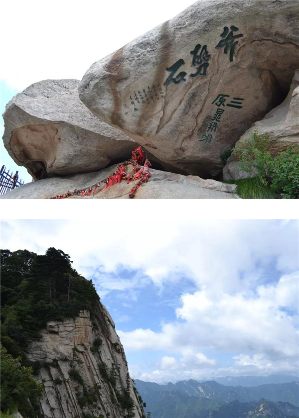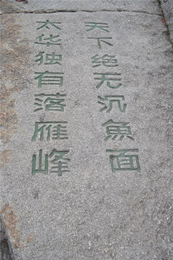 在南峰頂,孩子看到“天下絕無沉魚面,太華獨有落雁峰”的題刻,打趣我:“媽媽,你叫鴻雁,這里又叫落雁峰,真是和你有緣呢!快來這塊大石頭上落落腳,歇一歇!”“好?。≡蹅z都爬累了,都歇一歇!”我為孩子的體貼欣慰!