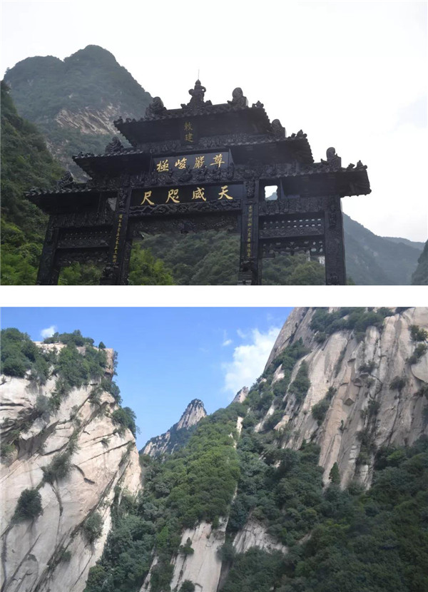 往西可去往中峰,往南可順原路返回,因暴雨如注,只得放棄攀爬中峰。順原路經(jīng)鷂子翻身,孩子仍念念不忘:“媽媽,這會兒大暴雨,肯定沒人排隊,咱們?nèi)シ_子翻身!”聽了孩子“初生牛犢不畏虎”的話,我不由哈哈大笑:“小傻瓜!這么大的暴雨,有誰去翻鷂子翻身呢?不要命啦?”在鷂子翻身入口處,孩子還是萬般眷戀地探身查看,當(dāng)看到還未來得及撤離的人員身系保險繩懸掛在峭壁上,就像風(fēng)雨中掉著蛛絲的蜘蛛,被風(fēng)雨襲擊的無處藏身、進(jìn)退兩難,方才知道了害怕。