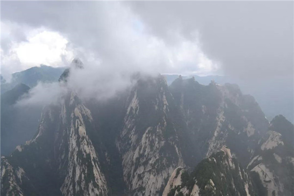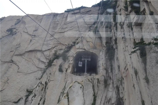 現(xiàn)在爬華山可不是“自古華山一條道”了,我們選擇坐西峰索道纜車,凌空飛渡千山萬壑。說是千山萬壑,其實華山是由一塊完整碩大的花崗巖石體構(gòu)成的?!渡胶=?jīng)》記載:“太華之山,削成而四方,其高五千仞,其廣十里。”真的很難想像,這么連綿起伏、巨大的山體,其實是一個群峰競秀的整體。華山,就是這么神奇!