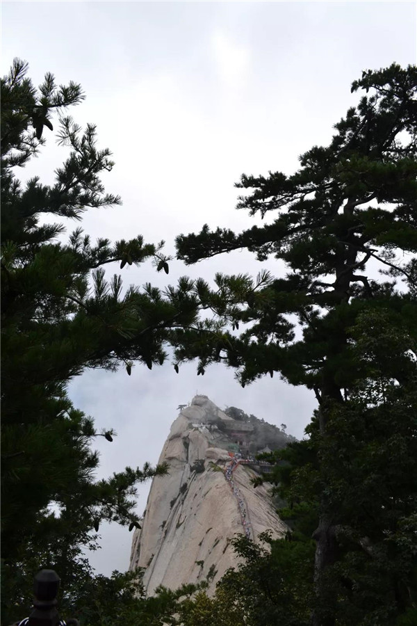 過金天宮,穿避詔崖,登南天門,來到令人膽寒的長空棧道附近。孩子一路上都在念叨要爬長空棧道,我搜腸刮肚地想阻止她的冒險念頭,可惜事與愿違,越阻止,越激起了孩子的好奇心,非爬長空棧道不可!孩子拉著我的手急切地奔到長空棧道上方升表臺,站在這方三面凌空、軒轅帝與群仙會聚的“聚仙臺”上,才發(fā)現(xiàn)長空棧道因故關(guān)閉了。我是長長舒了一口氣,孩子卻是失望至極!孩子不死心,拉著我抓著鐵鏈順著石道,又往下走了幾級石階,直到鐵鏈鎖閉的石門入口處。我倆手抓鐵鏈探身俯視,隱約可見絕壁上懸空的棧道。垂直的山壁上,幾株華山松挺直腰桿在生長,鐵鏈上拴的紅絲帶在迎風(fēng)飛舞。不知眼花了,還是心理作用,總覺得棧道在風(fēng)中輕輕晃動。