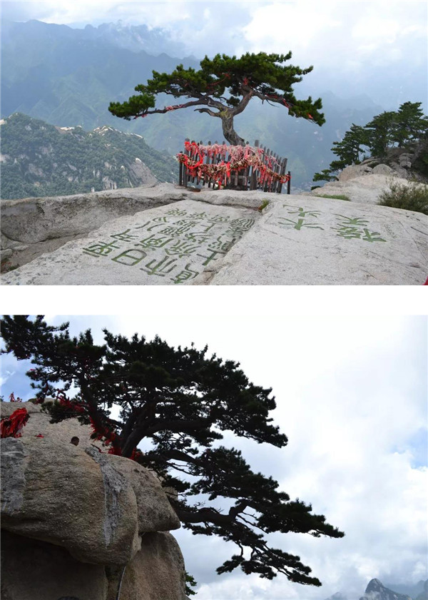 經(jīng)煉丹爐、孝子峰,云霧悄悄退隱,我們向南峰頂挺進(jìn)。南峰蒼翠秀麗,沿途的華山松千姿百態(tài),引人注目。華山迎客松生長于懸崖峭壁的石縫中,向懸崖一側(cè)伸出虬勁的枝干,就像好客的秦人伸出有力的大手歡迎遠(yuǎn)道而來的客人。虬枝龍形的枝干上,是綠意盎然的松針,根根好像要刺破天穹。華山迎客松在藍(lán)天白云的映襯下,仿如碧玉雕琢而成,綠的耀眼,秀挺卓然!