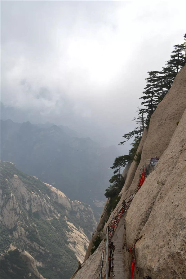 面向西峰方向,左側(cè)是斧劈般的絕壁,右側(cè)是坡度陡峭的山嶺。山脊兩側(cè)豎有結(jié)實的鐵柱,以腕粗的鐵鏈相連續(xù)。膽小的人屏住呼吸,緊抓鐵鏈前行;膽大的年輕人,不抓鐵鏈,走在中間,總讓人擔(dān)心他會滑跌!腳下的山脊有一定坡度,并不能踩平實,就像走在傾斜的平衡木上。緊窄處,上山下山的人需錯身通行。華山之險,讓我們刻骨銘心!