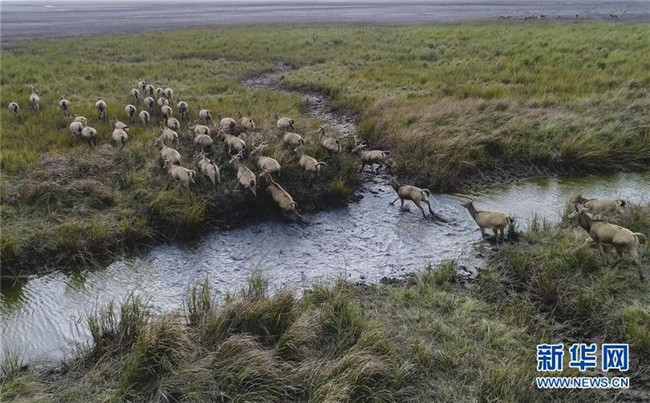 這是2017年11月14日在江蘇大豐麋鹿國家級自然保護區(qū)拍攝的麋鹿(無人機拍攝)。新華社記者 季春鵬 攝