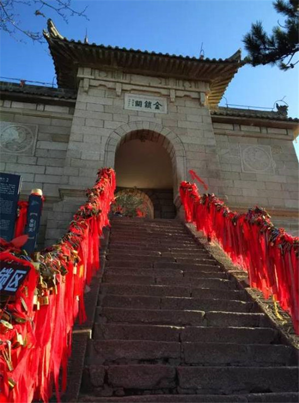 金鎖關(guān)——登山路兩側(cè)鐵索上情侶鎖,重重疊疊,紅繩彩線迎風(fēng)搖曳,在這里,鎖住你們對(duì)愛情的誓言,表達(dá)隊(duì)愛情忠貞!
