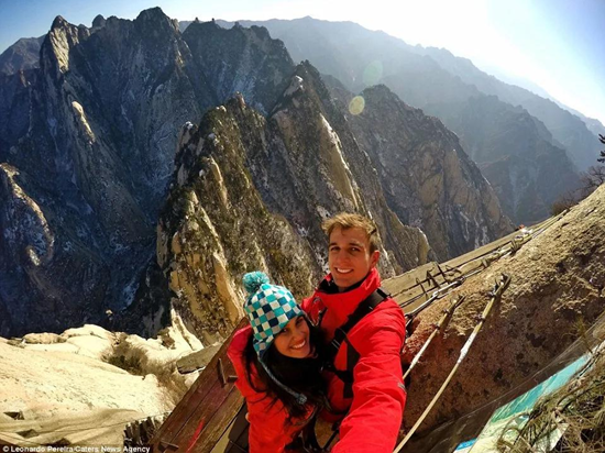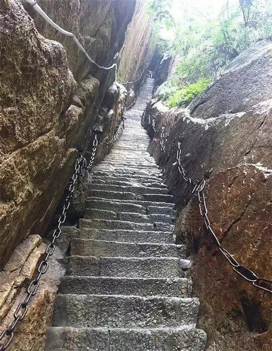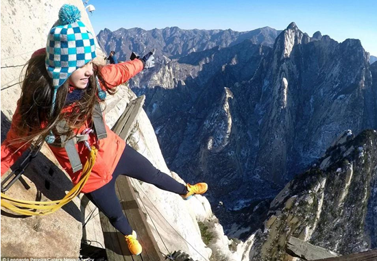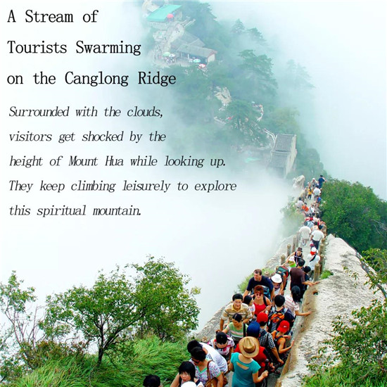 這是一個溫暖的美麗秋天,華山壯觀的峭壁在陽光下閃閃發(fā)亮,稀有樹木炫耀著多彩的秋葉,遠(yuǎn)方跳躍的瀑布吸引著游客的眼球,奇形怪狀的點(diǎn)點(diǎn)白云在腳下緩緩流動。我和我的朋友開始了一場艱苦的旅行,一起攀登6,600多級鑿在巖石上的臺階,目標(biāo)是海拔2154.9米南峰之巔祭祀華山神的道觀?! ?