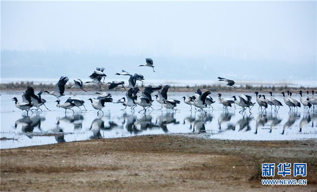 當(dāng)日,貴州省威寧彝族回族苗族自治縣草海國家級自然保護區(qū)內(nèi),黑頸鶴翩躚起舞、姿態(tài)萬千。