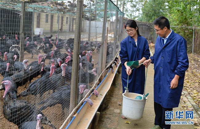 在江蘇省建湖縣陳甲村,返鄉(xiāng)創(chuàng)業(yè)的魯曼(左)和丈夫在養(yǎng)殖基地喂養(yǎng)火雞(2015年9月23日攝)。魯曼和丈夫的返鄉(xiāng)創(chuàng)業(yè),帶動(dòng)陳甲村發(fā)生巨變,回首創(chuàng)業(yè)的經(jīng)歷,已是全國(guó)人大代表的魯曼直言:“奮斗是艱辛的,也是幸福的。” 新華社記者 季春鵬 攝
