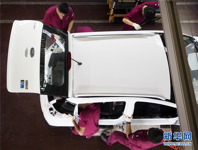 2018年8月7日,工人在安徽江淮汽車集團(tuán)股份有限公司安慶分公司新能源汽車總裝生產(chǎn)線上安裝純電動(dòng)車。 新華社記者 金立旺 攝