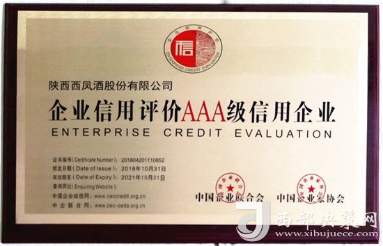 西鳳股份公司榮獲全國“AAA級(jí)信用企業(yè)”榮譽(yù)稱號(hào)