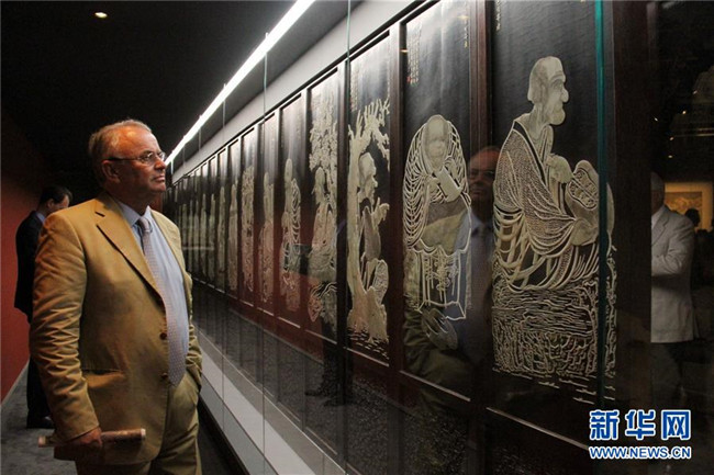 這是2017年7月13日,觀眾在摩納哥蒙特卡洛舉行的故宮文物展上參觀。 新華社記者 張曼 攝