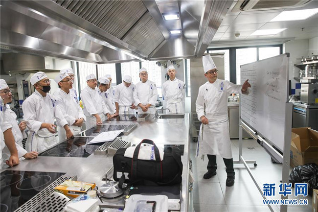 這是2018年10月17日, 來自法國的菲利普(右)在上海藍帶廚藝職業(yè)技能培訓學校的教室內(nèi)給學員們教授法式廚藝。 新華社記者 丁汀 攝