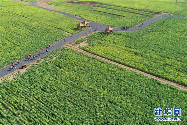 3月26日,游客在河北省沙河市東葛泉村觀賞油菜花(無人機(jī)拍攝)。
