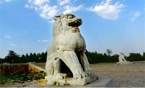 在橋陵的石雕中,特別值得一提的是橋陵的一對(duì)石獅子,歷經(jīng)千年的風(fēng)雨侵蝕,可威風(fēng)依然不減當(dāng)年,四肢健壯、昂首挺胸、怒目圓睜,顯示出“天地之間,唯我獨(dú)尊”的傲氣、霸氣,它造型優(yōu)美,氣勢(shì)磅礴,體現(xiàn)出唐代粗礦、奔放的時(shí)代氣息,而最讓人叫絕的是它的尾巴,從腿底鉆進(jìn)又掏出來卷曲于背部,動(dòng)物的調(diào)皮可愛活靈活現(xiàn)展現(xiàn)在我們眼前。它是石刻中的精品,石刻的精美,氣魄的宏大,堪稱“東方第一獅”。像這樣的獅子四個(gè)門前都有,保存的特別完好,東門的回頭望,西門的卷舌獅在唐代帝王陵中都是絕無僅有的。