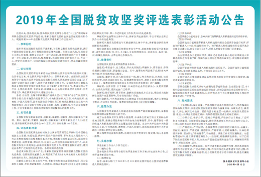 經(jīng)黨中央、國務(wù)院批準(zhǔn),國務(wù)院扶貧開發(fā)領(lǐng)導(dǎo)小組在“十三五”期間每年開展全國脫貧攻堅獎評選活動,表彰為脫貧攻堅作出突出貢獻的組織和個人?,F(xiàn)就開展2019年全國脫貧攻堅獎評選表彰工作公告如下。