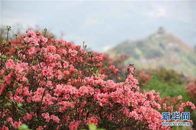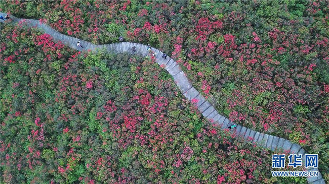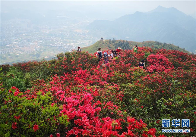 4月25日,游客在貴州省丹寨縣龍泉山景區(qū)觀賞映山紅。暮春時(shí)節(jié),位于貴州省黔東南苗族侗族自治州丹寨縣龍泉山景區(qū)的映山紅陸續(xù)開(kāi)放,紅遍山嶺,吸引眾多游客前來(lái)賞花觀光。 新華社記者 楊文斌 攝