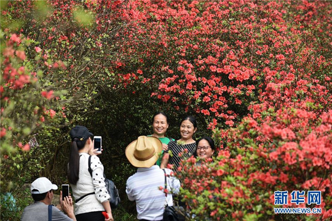 4月25日,游客在貴州省丹寨縣龍泉山景區(qū)的映山紅花間留影。暮春時(shí)節(jié),位于貴州省黔東南苗族侗族自治州丹寨縣龍泉山景區(qū)的映山紅陸續(xù)開(kāi)放,紅遍山嶺,吸引眾多游客前來(lái)賞花觀光。 新華社記者 楊文斌 攝