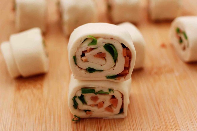 13.從面皮的一斷開(kāi)始卷起來(lái),一直卷到底。