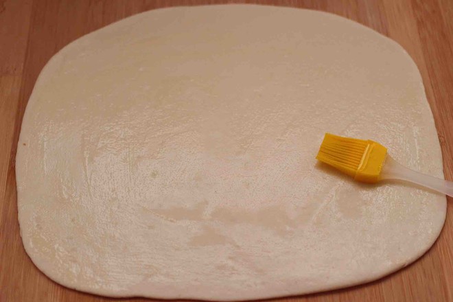 8.搟面杖搟成一塊盡量大的長(zhǎng)方形面片。 硅膠刷子蘸上花生油,均勻地涂抹在面皮上。