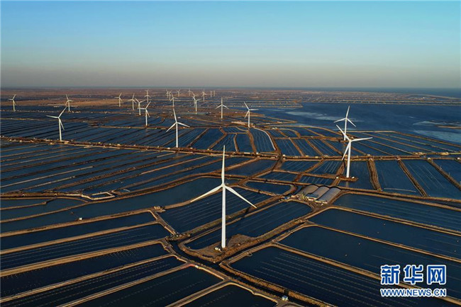 這是河北省唐山市樂亭縣姜各莊鎮(zhèn)海邊養(yǎng)殖區(qū)內(nèi)的風(fēng)電場(2018年11月10日無人機拍攝)。新華社記者 楊世堯 攝