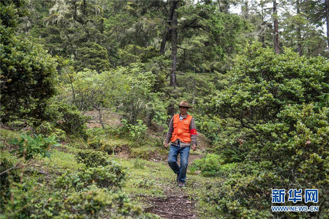 護林員孫諾在普達措國家公園里巡山護林(2018年7月18日攝)。新華社記者 胡超 攝