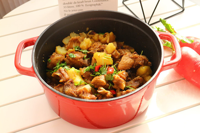 8.20分鐘后加入切好的土豆塊,小辣椒繼續(xù)燉15分鐘