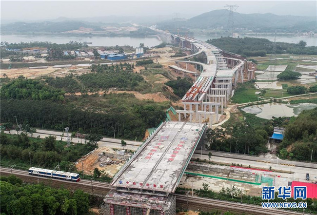 4月2日,由廣東省交通集團(tuán)投資建設(shè)、中鐵四局承建的汕(頭)湛(江)高速公路北江特大橋跨京廣鐵路、國道G240轉(zhuǎn)體橋成功轉(zhuǎn)體,這是轉(zhuǎn)體橋轉(zhuǎn)體后的位置(無人機拍攝)。 新華社記者 劉大偉 攝