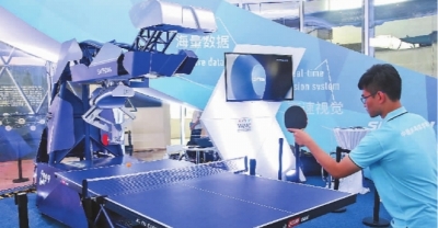 工作人員在2018世界人工智能大會(huì)現(xiàn)場演示與機(jī)器人打乒乓球。新華社發(fā)