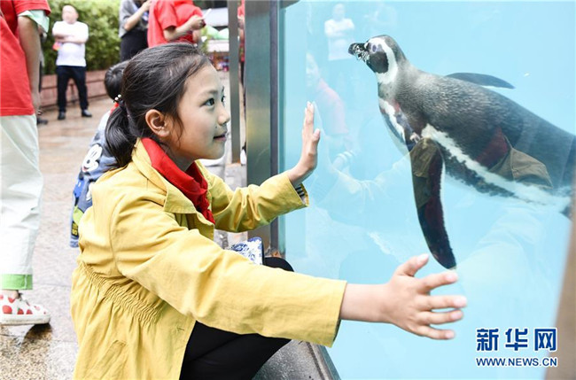 5月29日,在重慶市動(dòng)物園內(nèi)的互動(dòng)區(qū),蓼子鄉(xiāng)第一中心小學(xué)的馬嬌陽在觀賞企鵝。新華社記者 劉潺 攝