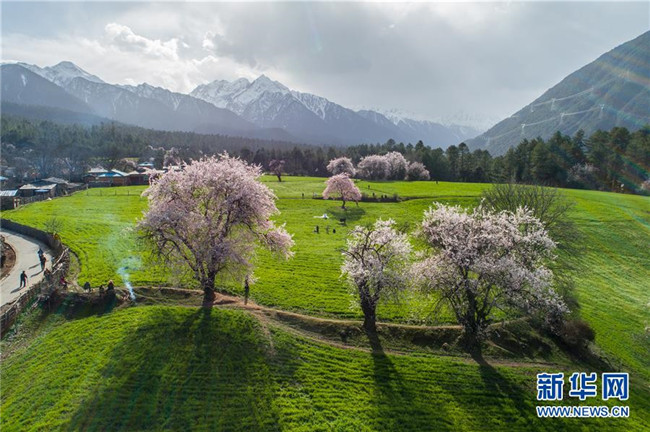 西藏林芝波密縣境內(nèi)桃花盛開的田園風(fēng)光(4月5日無人機拍攝)。新華社記者 李鑫 攝