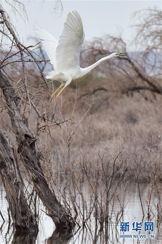 6月9日,一只白鷺在新疆烏倫古湖國家濕地公園飛翔。新華社記者 丁磊 攝