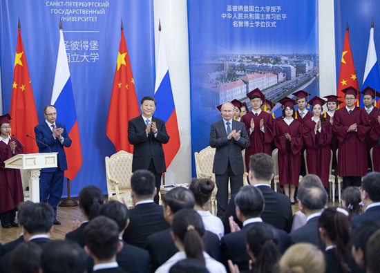 當(dāng)?shù)貢r(shí)間6月6日,又一場(chǎng)特殊儀式在圣彼得堡國(guó)立大學(xué)舉行。習(xí)近平被授予圣彼得堡國(guó)立大學(xué)名譽(yù)博士學(xué)位。他在答辭中說道,這既是雙方教育和人文領(lǐng)域密切交流的例證,更是中俄關(guān)系高水平的重要體現(xiàn)。他同時(shí)希望雙方不斷擴(kuò)大教育領(lǐng)域交流合作。