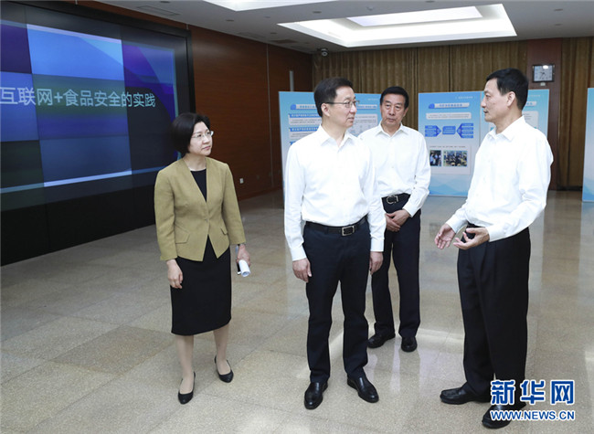 6月13日,在2019年全國食品安全宣傳周活動前夕,中共中央政治局常委、國務(wù)院副總理、國務(wù)院食品安全委員會主任韓正到國務(wù)院食品安全委員會辦公室主持召開座談會,聽取對食品安全工作的意見建議。這是會前,韓正參觀食品安全工作情況展示,考察了解食品安全智慧監(jiān)管的創(chuàng)新舉措。新華社記者龐興雷攝