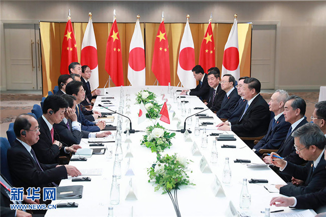 習(xí)近平強調(diào),雙方要始終恪守中日四個政治文件確立的各項原則,踐行中日“互為合作伙伴、互不構(gòu)成威脅”的政治共識,增進(jìn)互信,推動中日關(guān)系始終沿著和平、友好、合作的正確軌道持續(xù)向前發(fā)展。要深化經(jīng)貿(mào)、投資、第三方市場、科技創(chuàng)新等廣泛領(lǐng)域合作,打造新的合作增長點,積極引領(lǐng)區(qū)域經(jīng)濟(jì)一體化。我們歡迎日本企業(yè)積極擴大對華合作,分享中國發(fā)展新機遇。共建“一帶一路”倡議為中日互利合作開辟了廣闊天地,歡迎日方積極參與。雙方要拉緊人文紐帶,加強兩國青少年交流,促進(jìn)兩國民眾相知相親。我贊同年內(nèi)啟動中日高級別人文交流磋商機制。要通過對話協(xié)商建設(shè)性管控矛盾分歧,加強外交和安全領(lǐng)域?qū)υ?,?gòu)建建設(shè)性雙邊安全關(guān)系。希望日方恪守迄今共識和承諾,妥善處理好歷史等敏感問題,共同維護(hù)東海和平穩(wěn)定。中日應(yīng)該加強在國際和地區(qū)事務(wù)中的溝通、協(xié)調(diào)、合作,共同應(yīng)對全球性挑戰(zhàn),推動全球治理更加公正合理。中方支持日方辦好二十國集團(tuán)領(lǐng)導(dǎo)人大阪峰會,期待峰會發(fā)出維護(hù)多邊主義和自由貿(mào)易的明確聲音,為世界經(jīng)濟(jì)發(fā)展注入穩(wěn)定預(yù)期和動力。