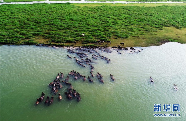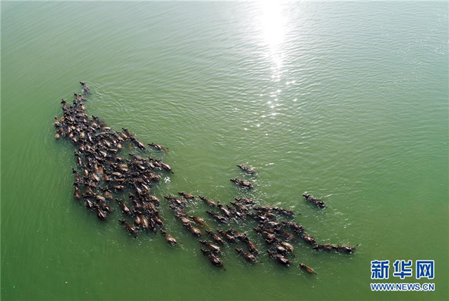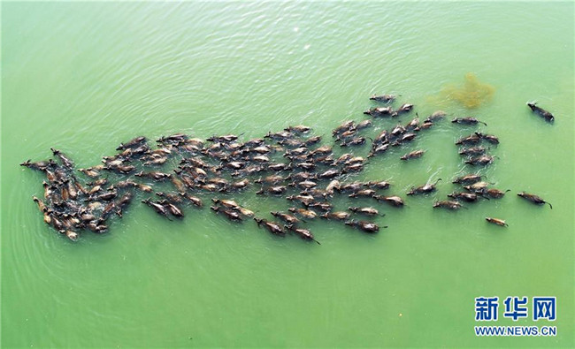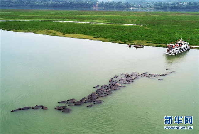 7月2日傍晚,在四川省南充市蓬安縣油房溝村,百余頭水牛橫渡嘉陵江歸欄(無(wú)人機(jī)拍攝)。新華社發(fā)(劉永紅攝)