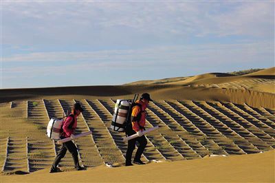 “沙袋內(nèi)只需充填干沙,平鋪于沙表面即完成了聚乳酸沙袋沙障的鋪設(shè)。同草方格等傳統(tǒng)沙障相比較,其鋪設(shè)效率可提高3至5倍、材料搬運(yùn)量降低20至60倍。障體材料輕便,真正實(shí)現(xiàn)了‘以沙治沙’的科學(xué)理念。”虞毅說。