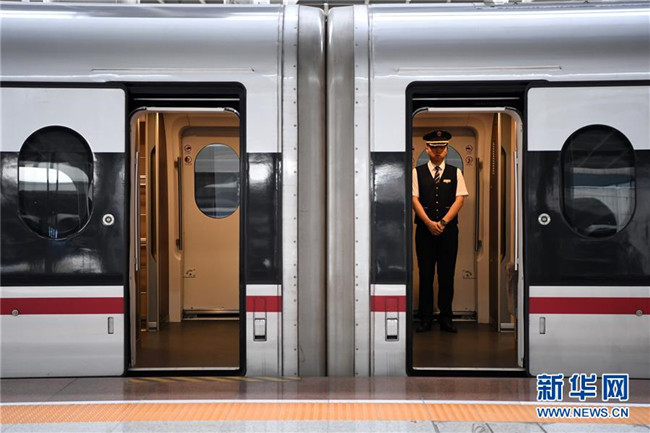 7月11日,乘務(wù)員在G319次列車上等待旅客上車。當(dāng)日,重慶至香港直達(dá)高鐵正式開通,此次首發(fā)的G319次復(fù)興號列車運(yùn)行速度350km/h,沿途經(jīng)停遵義、貴陽東、桂林西、肇慶東、廣州南和深圳北站。列車由重慶西站至香港西九龍站全程運(yùn)行需7小時37分鐘,全程票二等座票價為660元。目前內(nèi)地與香港聯(lián)通的高鐵車站已增加到58個。新華社記者唐奕攝