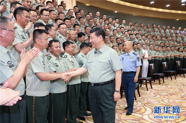 7月15日至16日,中共中央總書記、國(guó)家主席、中央軍委主席習(xí)近平在內(nèi)蒙古考察并指導(dǎo)開展“不忘初心、牢記使命”主題教育。這是16日上午,習(xí)近平在呼和浩特親切接見駐內(nèi)蒙古部隊(duì)副師職以上領(lǐng)導(dǎo)干部和團(tuán)級(jí)單位主官,代表黨中央和中央軍委向駐內(nèi)蒙古部隊(duì)全體官兵致以誠(chéng)摯問候。 新華社記者 李剛 攝