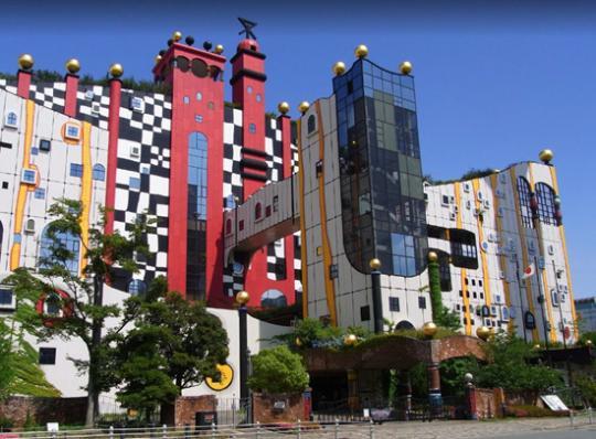 而在《名偵探柯南》里出現(xiàn)的垃圾處理廠也有真實(shí)場(chǎng)景。由宮崎駿的偶像百水先生進(jìn)行外觀設(shè)計(jì)的大阪舞洲島垃圾處理廠,遠(yuǎn)遠(yuǎn)看去仿佛游樂場(chǎng),不知情的人絕不會(huì)把它和垃圾聯(lián)系在一起。處理廠干凈整潔、色彩明亮得恍若安徒生的童話世界,紅黃的條紋象征著燃燒的火焰,形態(tài)各異的可愛窗子與爬山虎裝點(diǎn)著墻壁,標(biāo)志性的長(zhǎng)管煙囪令人想起長(zhǎng)發(fā)公主的城堡……