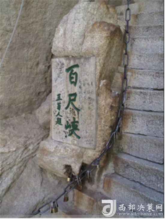 第二道險關(guān)是百尺峽。這里兩壁高聳,中間夾著一塊從天而降的巨石,上刻“驚心石”三個大字,游人從石下小路穿過,確實驚心動魄。第三道險關(guān)是老君犁溝,這是夾在陡峭石壁之間的一條溝狀險道,有570多個石階。相傳這里原先根本沒有路,太上老君見了,就將手中的如意柄變成一張鐵犁, 又牽來青牛,一夜間犁成了這條山溝。傳說青牛犁完溝后,見華山景色壯美,便化為石牛,永遠地留在了華山之上。溝的盡頭是一道陡壁, 名為“猢猻愁”。顧名思義,連猴子都發(fā)愁,可見這里的山勢多么陡峭。