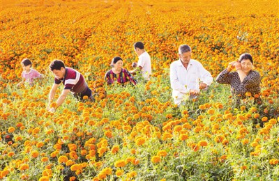 近年來,新疆維吾爾自治區(qū)的莎車晨光生物公司通過“公司+基地+合作社+農(nóng)戶”的形式帶動農(nóng)民大面積種植萬壽菊,7年來累計帶動農(nóng)民增收6億多元,實現(xiàn)出口創(chuàng)匯4357萬美元,繳納稅金1200多萬元,使5萬多貧困戶擺脫了貧困。圖為7月18日,莎車縣的維族群眾正在采摘被他們譽為“致富花”的萬壽菊。本報記者史家民攝
