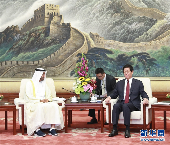 7月22日,全國(guó)人大常委會(huì)委員長(zhǎng)栗戰(zhàn)書在北京人民大會(huì)堂會(huì)見阿聯(lián)酋阿布扎比王儲(chǔ)穆罕默德。新華社記者 龐興雷 攝
