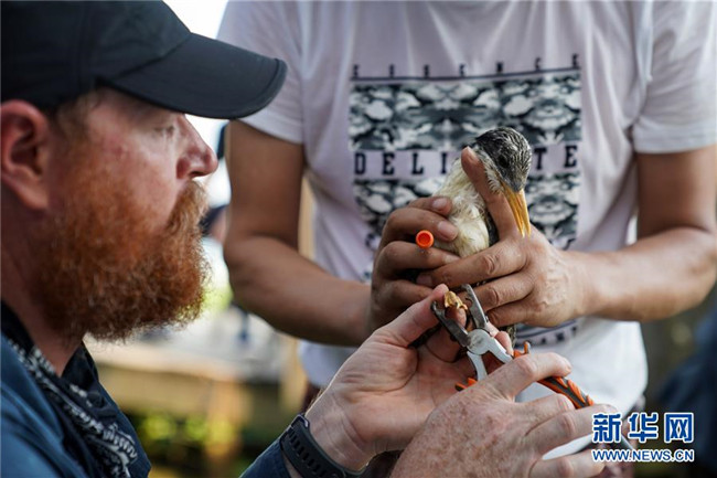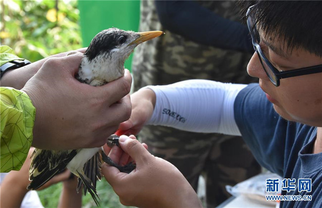 7月25日,美國(guó)鳥(niǎo)類保護(hù)專家在浙江韭山列島國(guó)家級(jí)自然保護(hù)區(qū)為一只鳳頭燕鷗幼鳥(niǎo)戴上標(biāo)志。新華社記者 殷曉圣 攝