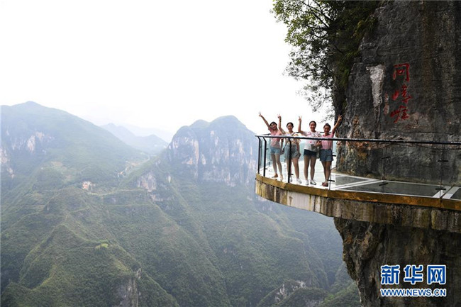 7月30日,游客在云陽龍缸國家地質(zhì)公園絕壁玻璃棧道上留影。