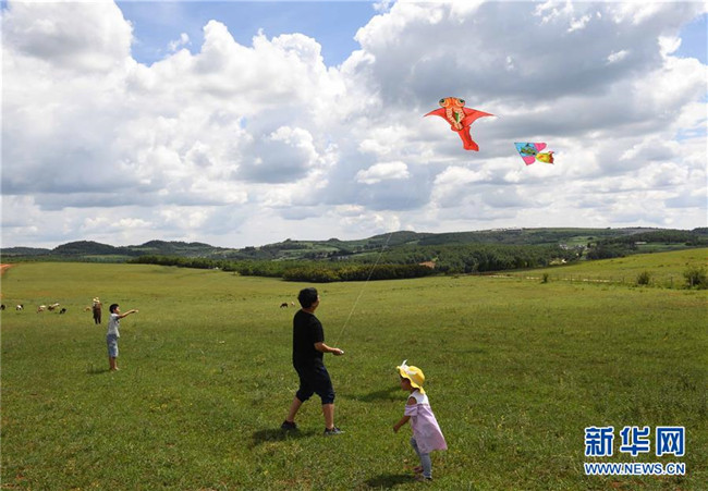 8月10日,游人在云南尋甸北大營草場放風(fēng)箏。 新華社記者楊宗友攝